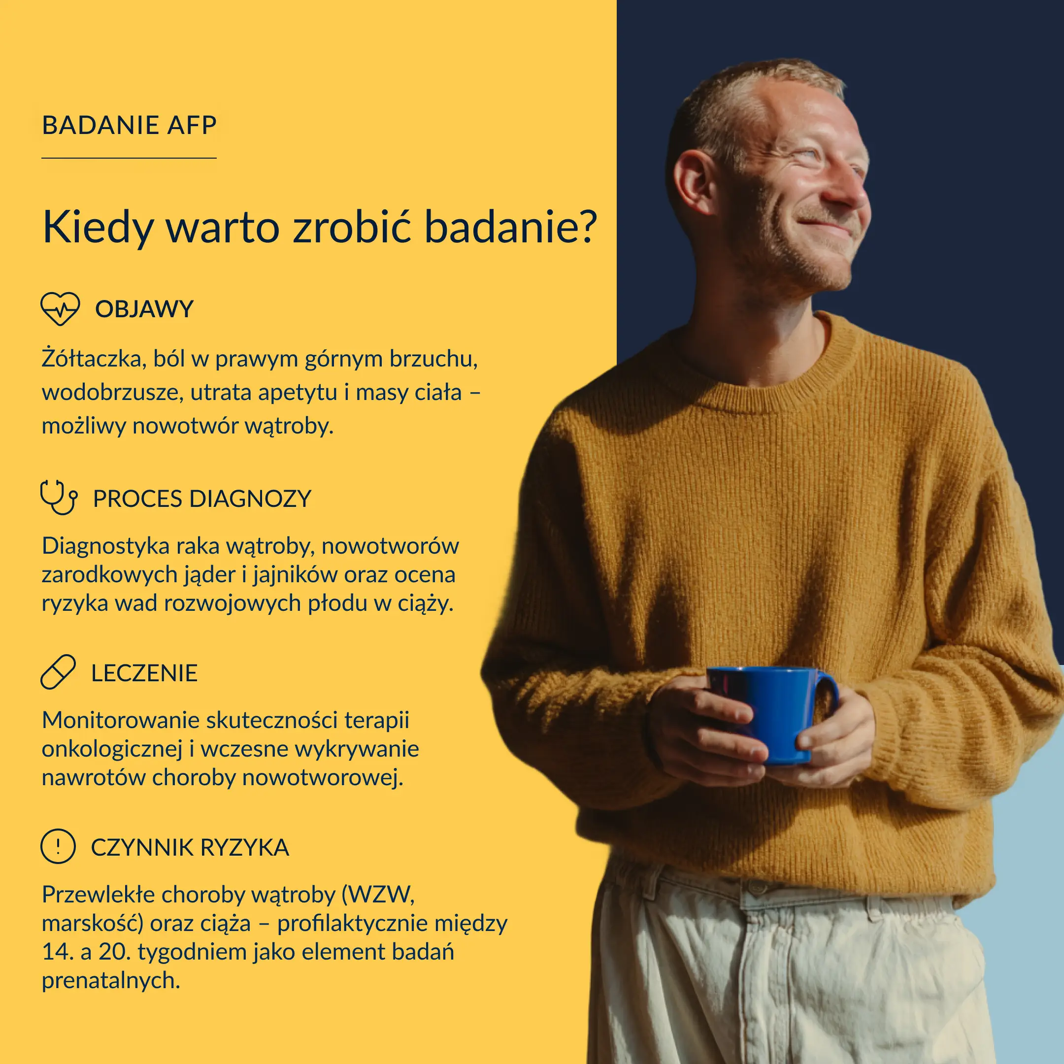 Nie. Podwyższony poziom AFP może mieć wiele przyczyn, w tym choroby wątroby (np. zapalenie, marskość) albo ciążę mnogą. Dlatego nie należy wyciągać wniosków samodzielnie – zawsze skonsultuj wynik z lekarzem.