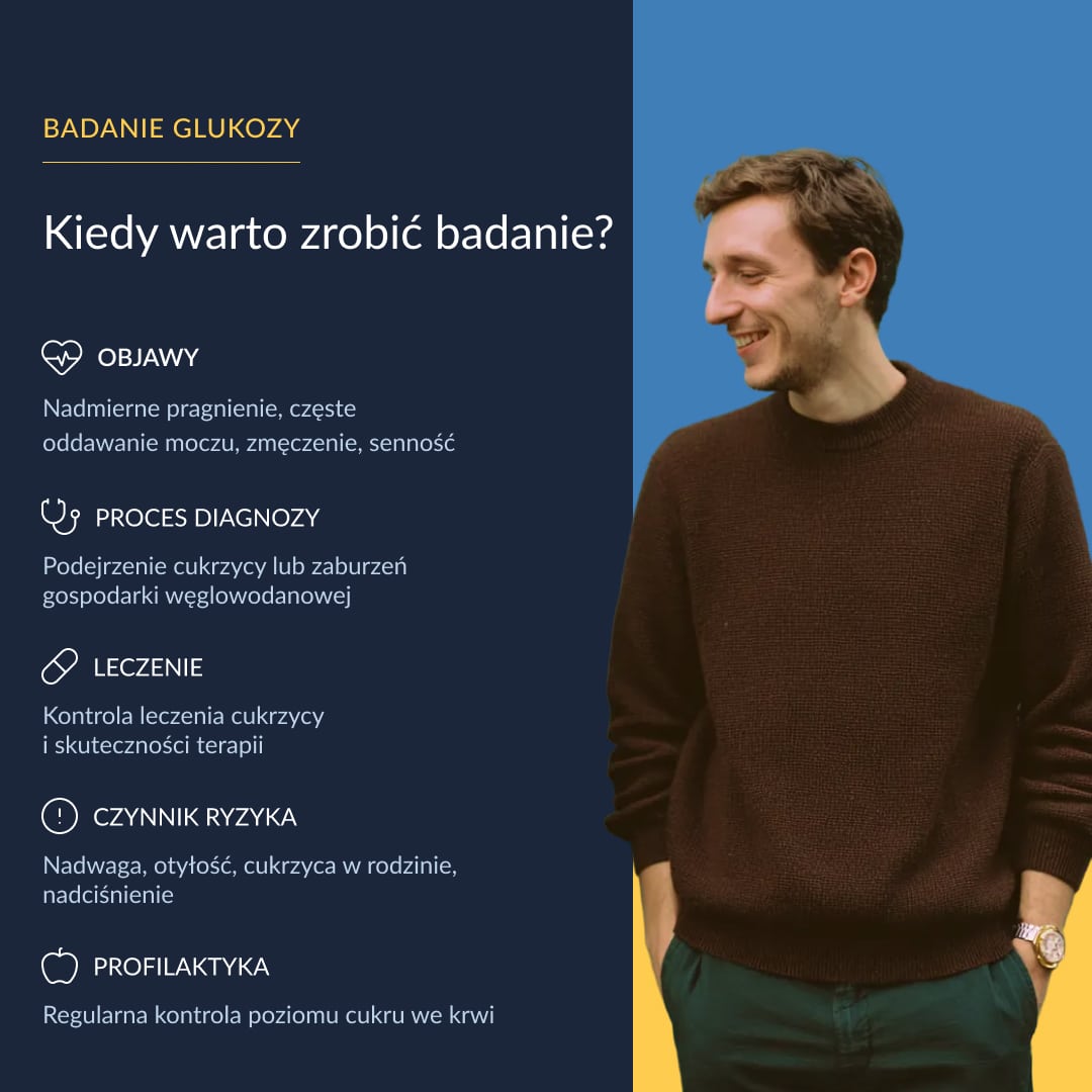Badanie poziomu glukozy we krwi to podstawowe narzędzie w diagnostyce cukrzycy. Pomaga wykryć nieprawidłowości zanim pojawią się wyraźne objawy: od hipoglikemii, przez stan przedcukrzycowy (nieprawidłową glikemię na czczo i/lub nieprawidłową tolerancję glukozy), aż po cukrzycę. Wynik wykorzystuje się też do kontroli skuteczności leczenia i oceny, jak organizm radzi sobie z gospodarką węglowodanową na co dzień.