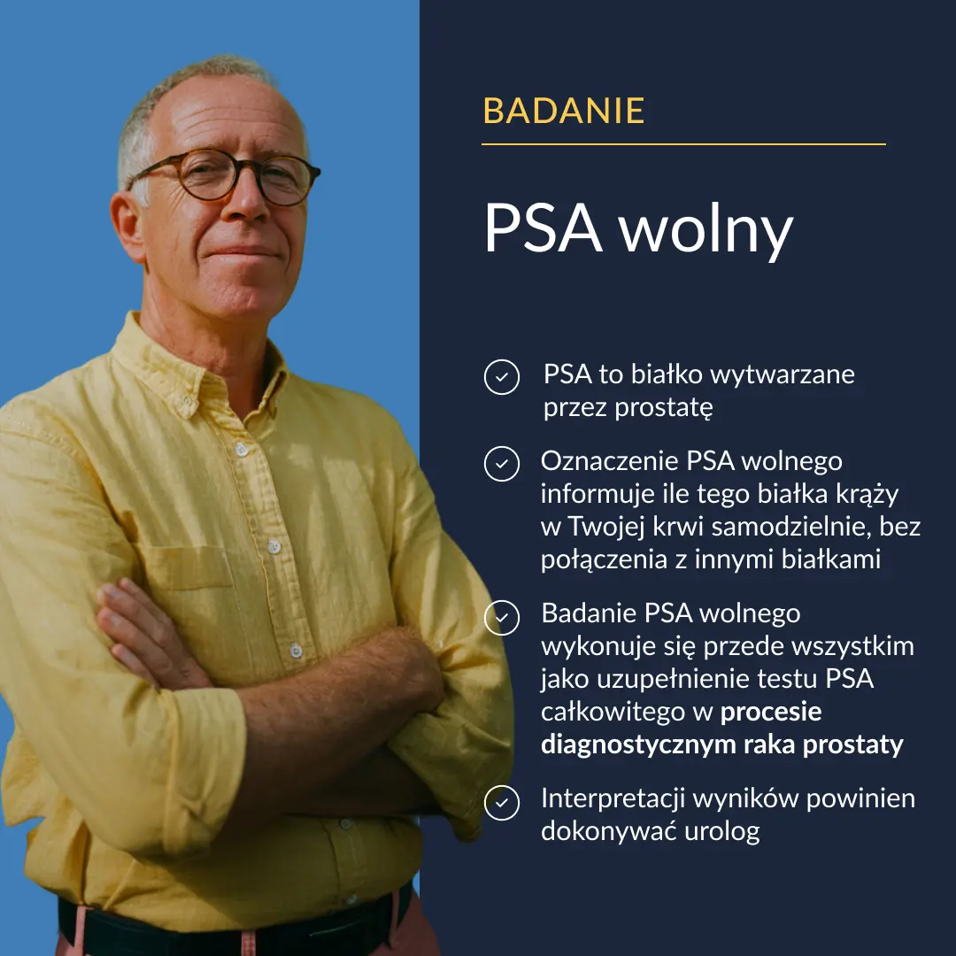 PSA wolny, czyli swoisty antygen sterczowy (prostatę-specific antygen) to rodzaj hormonu produkowanego tylko przez męski gruczoł krokowy (prostatę). Prostata, zwana także sterczem, jest niewielkim narządem znajdującym się w miednicy u mężczyzn, który okala cewkę moczową. Jego funkcja to przede wszystkim produkcja płynu nasiennego, który razem z plemnikami tworzy spermę.
