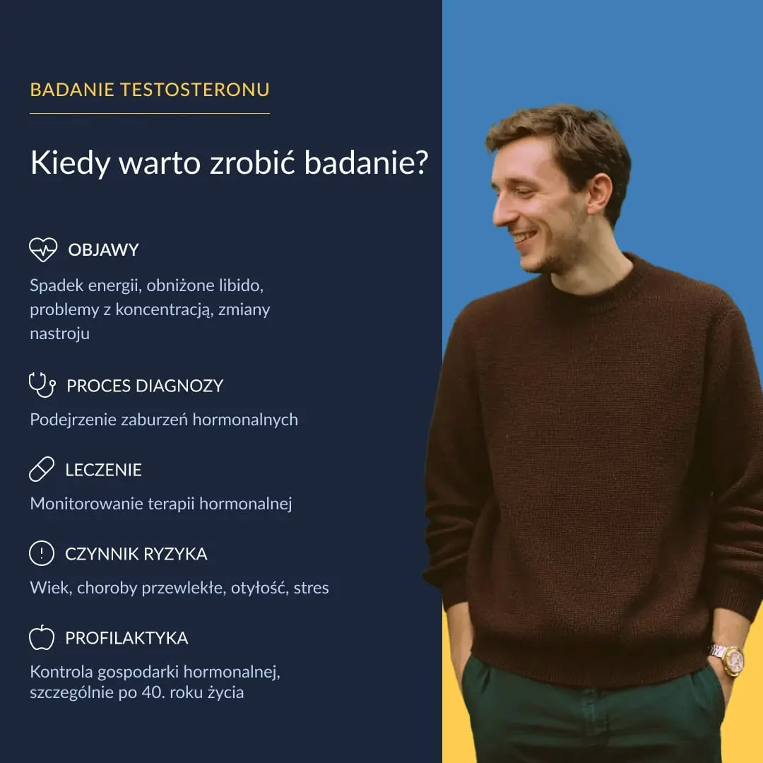 Testosteron to jeden z kluczowych hormonów regulujących funkcjonowanie organizmu, nie tylko w kontekście płciowości, ale także metabolizmu, masy mięśniowej, gęstości kości, samopoczucia i poziomu energii. Jego stężenie zmienia się wraz z wiekiem, stylem życia i stanem zdrowia. Badanie pozwala lepiej zrozumieć przyczyny dolegliwości takich jak spadek libido, przewlekłe zmęczenie czy zaburzenia płodności.