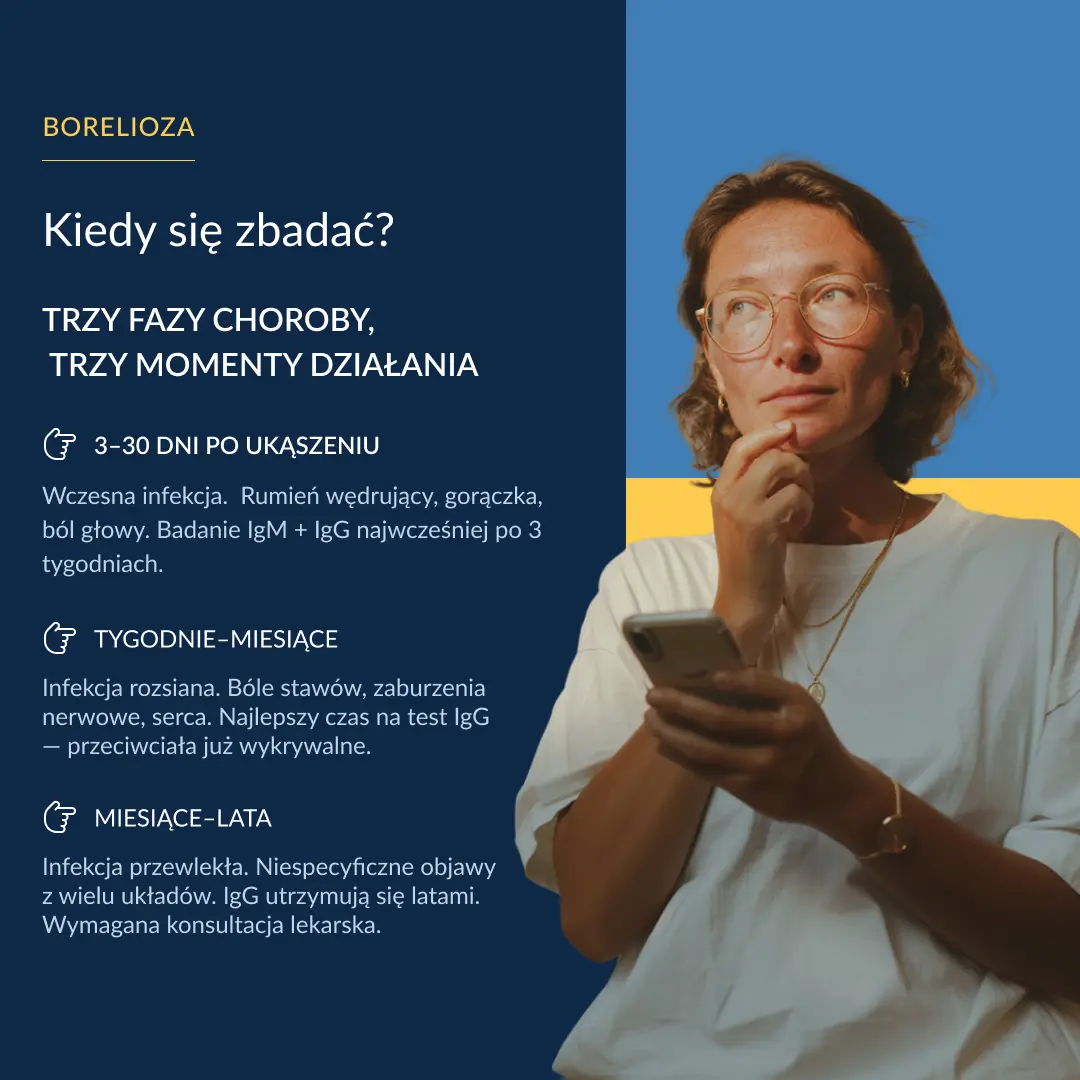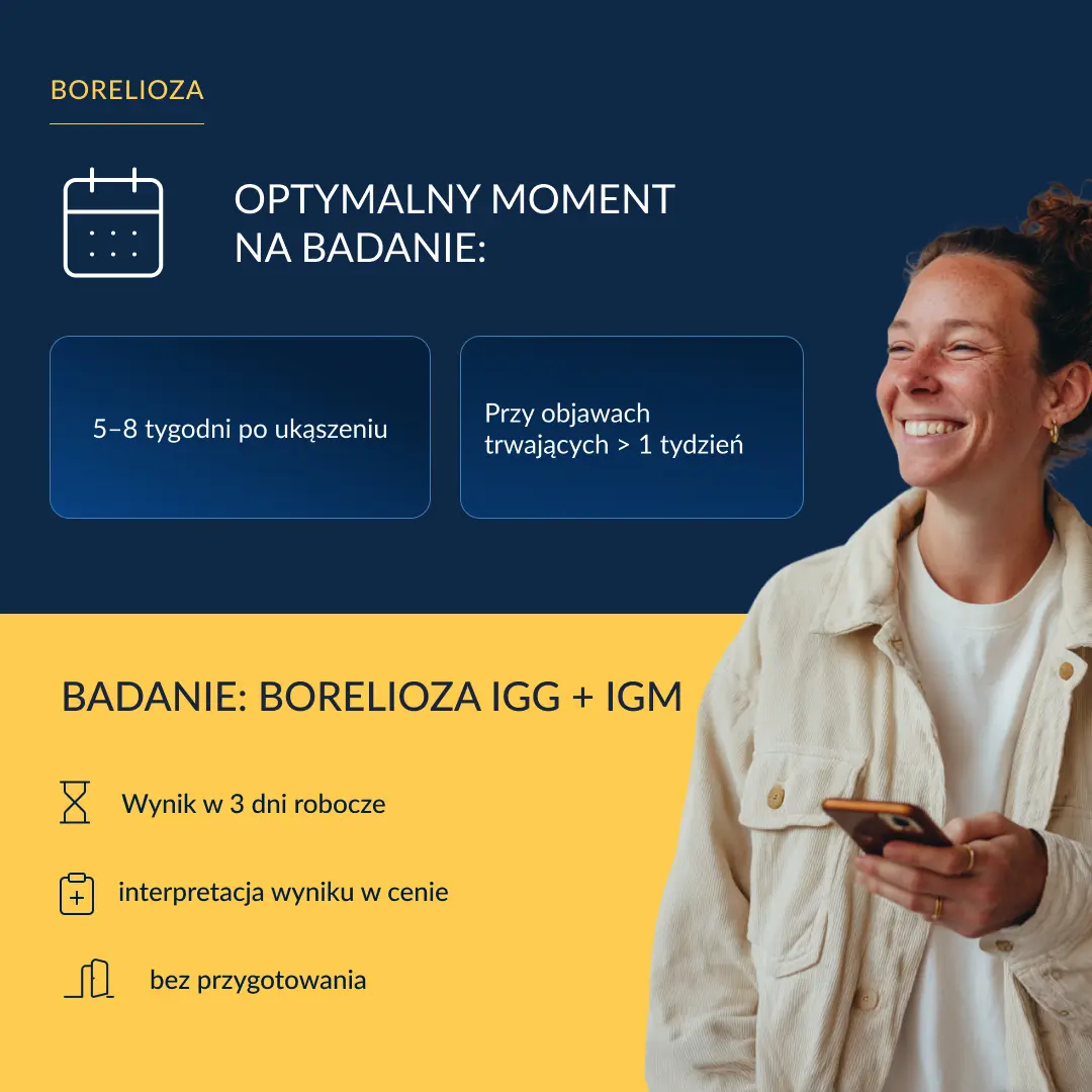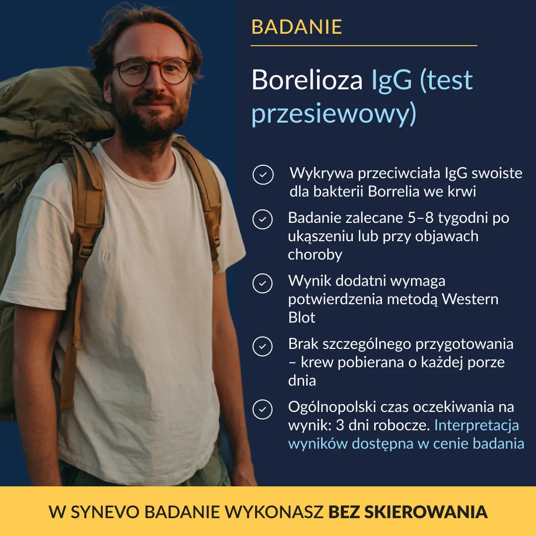 Badanie krwi na boreliozę wykrywające przeciwciała IGG swoiste dla czynnika wywołującego boreliozę przenoszoną przez kleszcze. Zalecane minimum 5–8 tygodni po ukąszeniu lub przy objawach takich jak rumień wędrujący, bóle stawów czy przewlekłe zmęczenie.